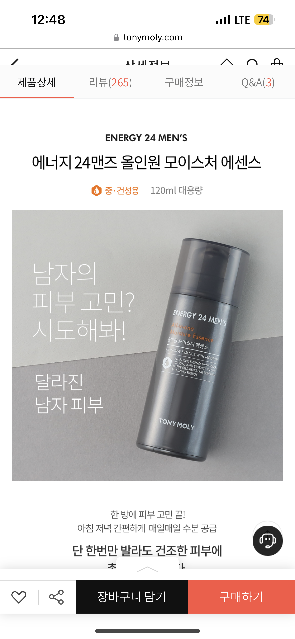에너지24맨즈 올인원 모이스처 제품은 스킨 + 로션 + 에센스를 한병에 담아 한번만 바르면 되는 제품입니다.